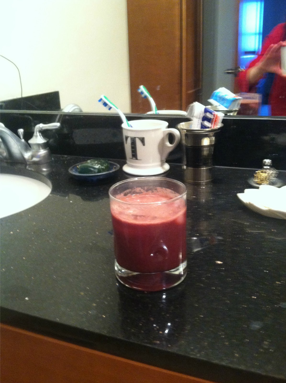 If you look closely you can see yours truly in her bathrobe photographing the juice. Yes - I wear a bright red robe.